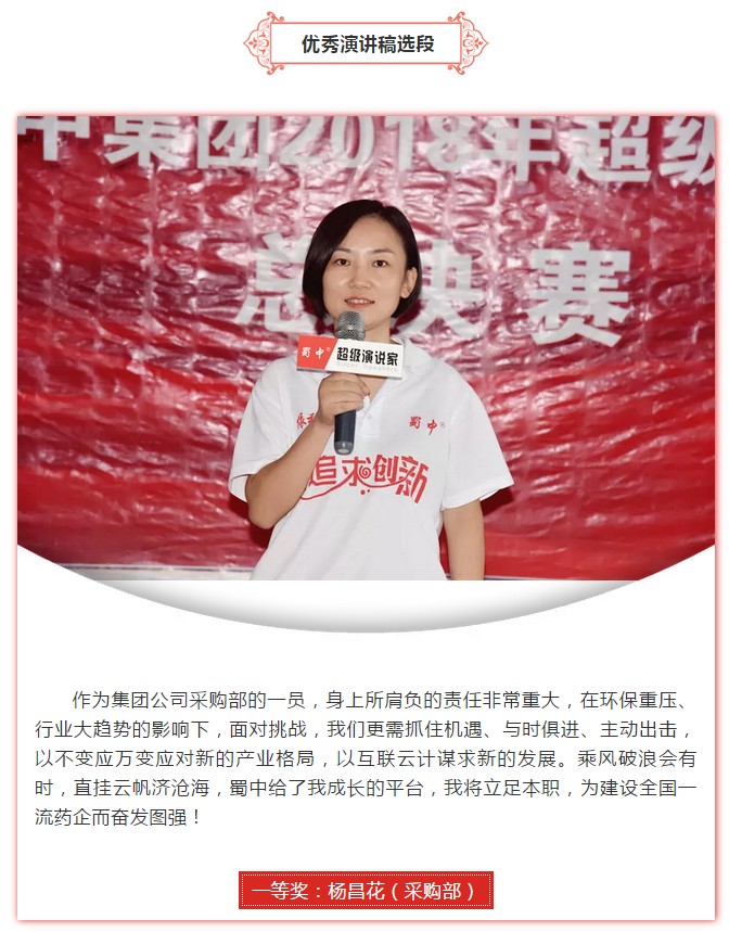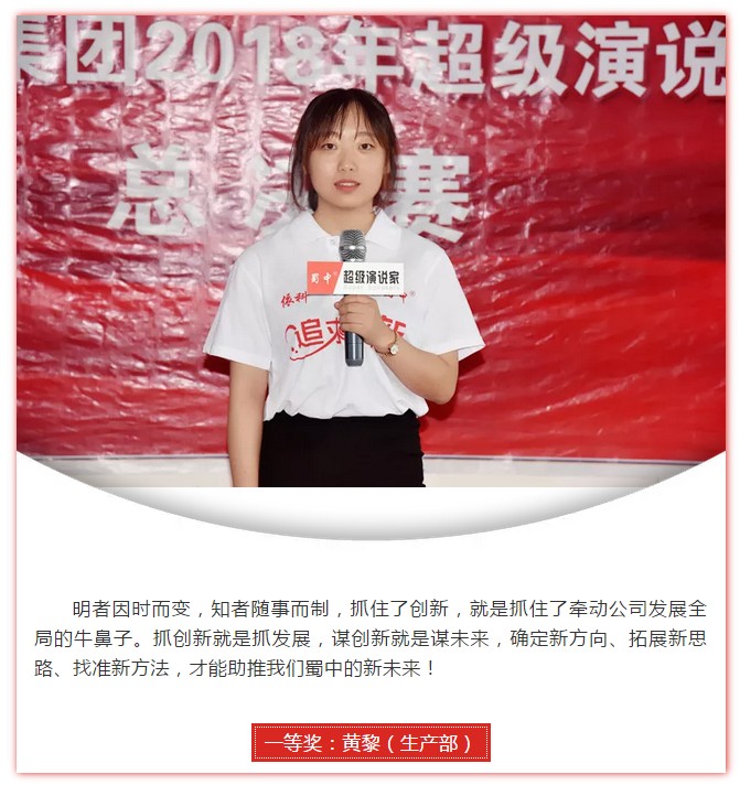 本次演讲决赛以“新思绪 新要领—助推蜀中新未来”为主题 ,来自各部分的同事都赛出了气概 ,赛出了水平 ,充分展现了蜀中子女的飒爽英姿和别样风范。经由强烈角逐 ,决赛共评出一等奖两名、二等奖四名、三等奖六名、优异奖七名。此次角逐已圆满落下帷幕 ,希望受到夸奖的小我私家要以此为起点 ,再接再厉 ,继续坚持向上的态度 ,立异进取 ,起劲投身到以后的各项的事情中去 ,磨炼所学 ,增添本领 ,在事情中取得更大、更好的效果 ,起劲把自己作育成为顺应公司生长需求的新型人才。